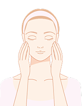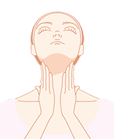 口からアゴの下へ、さらに耳の後ろ首の付け根から鎖骨まで順にゆっくりと押しながらさするようにリンパを流すとより効果的です。